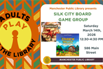 Silk City Board Game Group- March 2026 14 Mar 2026 Join us for our final board game event in this building! We’re bringing back old favorite games that we have taught in the past to celebrate. Learn to play: Stardew Valley, Emberheart, Castle of Burgundy, Panda Royale, Clank! In! Space!, and Marvel Champions.No need to bring any games; we'll provide them all. Free program for adults; light refreshments to be served. Manchester Public Library, 586 Main Street, Manchester, CT 06040 Tagged as: , Adults, Library