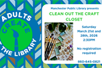 Clean Out the Craft Closet (Adults; No Registration Required) 21 Mar 2026 In anticipation of our move to the new library building, help us clean out our craft closet! During this program we’ll bring out random craft supplies from over the years that have not been used and you can use them to be as creative as you wish. Supplies will vary for each program date and will be limited. No registration required for this free program for adults. Manchester Public Library, 586 Main Street, Manchester, CT 06040 1 more date Tagged as: , Workshops, Adults, Library