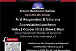 6th Annual First Responders and Veterans Luncheon 2025 Published on September 22, 2025 The Greater Manchester Chamber of Commerce is proud to announce the 6th Annual First Responders and Veterans Luncheon, taking place on Friday, October 10, 2025, from 11:30 AM to 2:30 PM at the Chamber headquarters, 20 Hartford Road, Manchester, CT. Tagged as: , Announcements & Media Releases